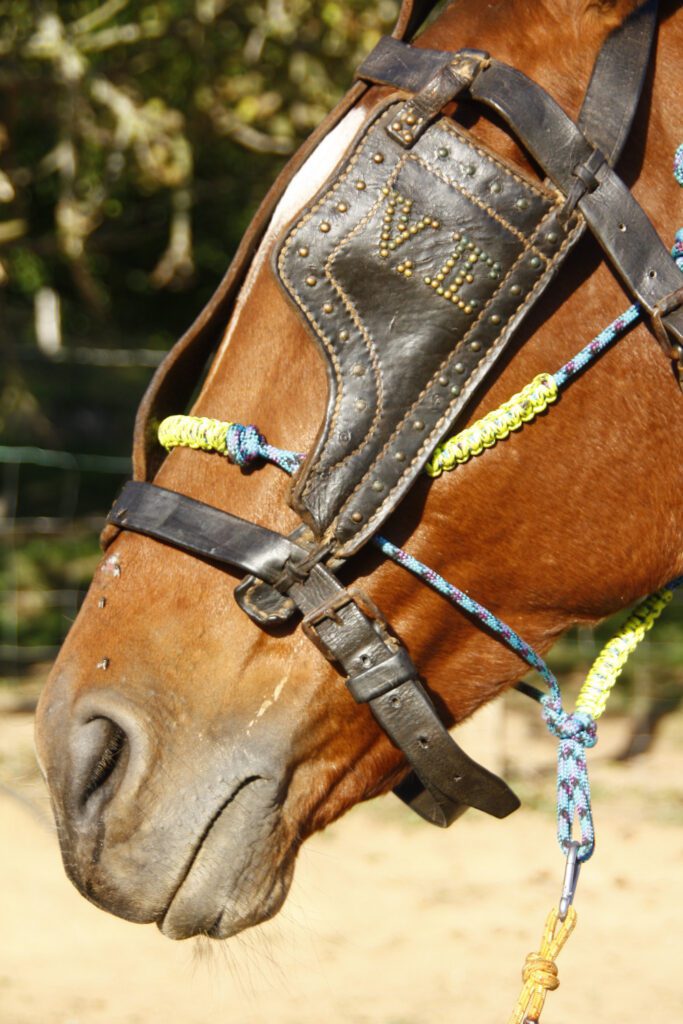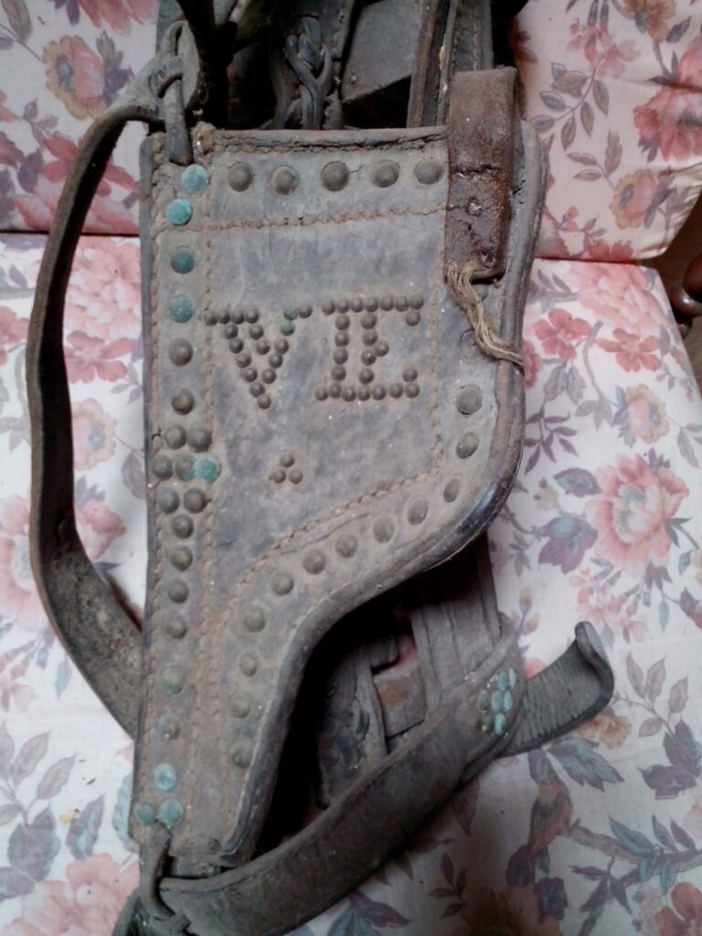 En un principio no fuí capaz de identificar nada reseñable bajo las capas de polvo pero en un rincón divisé una antigua cabezada con las iniciales «V.E.» remachada. Y al lado otra, y una tercera. Redios, ¡TRES CABEZADAS de mi difunto abuelo Vicente Esquisabel! En ese momento me dió apuro pedirles a Francisco y a Alicia las cabezadas de mi abuelo y apenado las dejé en su lugar. Es más, ni el propio Francisco sabía que estaban allí. Hau marka gero!