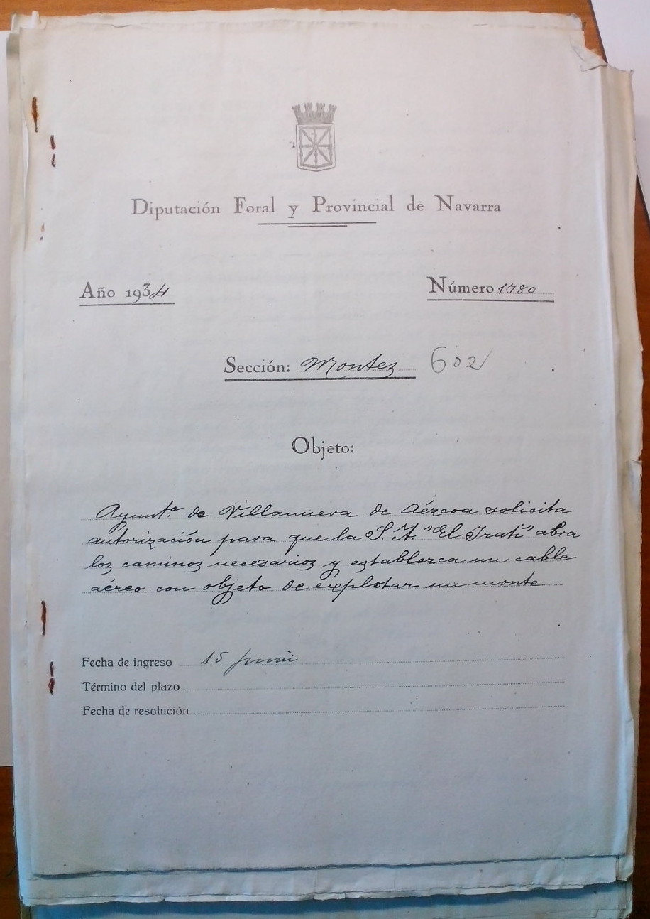 Como podemos observar en la imagen adjunta, en el Archivo General de Navarra existe un expediente redactado en 1934 por la Dirección de Montes de la antigua Diputación Provincial de Navarra donde se detalla la solicitud de la S.A. “El Irati” para la apertura de caminos y la instalación de un cable aéreo.